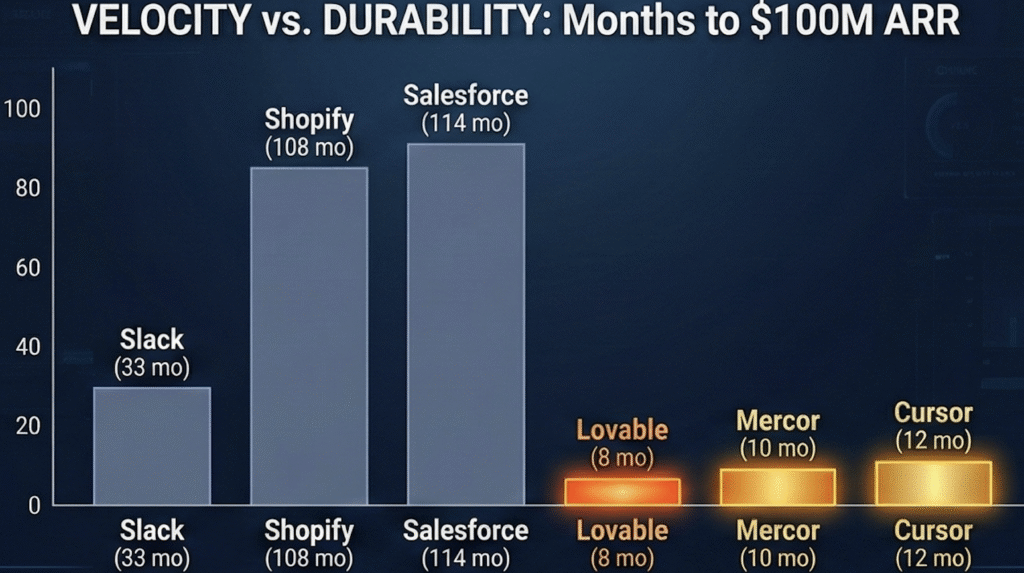 Every morning there is a new record on my feed. Lovable hit 100M ARR in eight months and is already pacing toward 300M. Mercor did it in ten. Cursor did it in twelve and just crossed a billion. OpenAI just tripled to 20B in a single year. The timeline of growth has effectively gone vertical and we are all supposed to be applauding the efficiency.